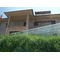 Vivienda con aleros de hormigon visto laterales de piedra frontal de terraza de piedra . Suelos de parquet flotante