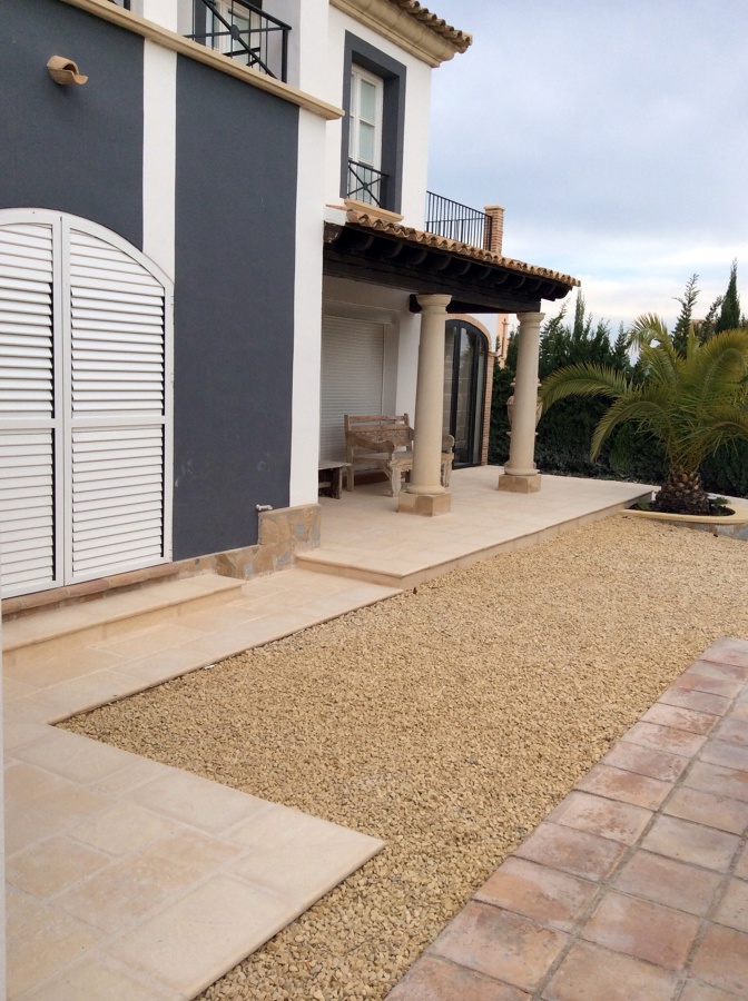 Derribo y extracción de escombros a vertedero de todas las jardineras y terrazas de la parte trasera y frontal incluido terraza y borde de piscina. Arrancar todas las viejas plantas y colocar nuevas y suministro de grava del 2 de la anuncia en casa de claude van derkel.