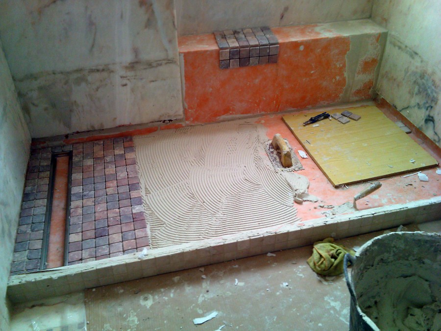 En este proyecto se quitó la bañera existente y se construyó un plato de ducha que realizamos de obra como pueden ver. En las fotos se ve muy claramente los distintos pasos de la construcción de un plato de ducha hecho de obra, primero pusimos una cama de gravín luego hicimos una carpeta de cemento hidrófuga, la pintamos con cloro caucho pusimos una membrana hidrófuga especial para platos y piscinas, comenzamos a colocar el gresite en este caso de trozos de mármol, rejuntamos con pasta especial piscinas y colocamos una mampara de cristal.