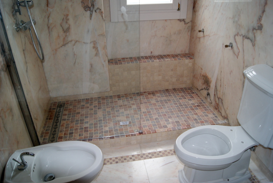 En este proyecto se quitó la bañera existente y se construyó un plato de ducha que realizamos de obra como pueden ver. En las fotos se ve muy claramente los distintos pasos de la construcción de un plato de ducha hecho de obra, primero pusimos una cama de gravín luego hicimos una carpeta de cemento hidrófuga, la pintamos con cloro caucho pusimos una membrana hidrófuga especial para platos y piscinas, comenzamos a colocar el gresite en este caso de trozos de mármol, rejuntamos con pasta especial piscinas y colocamos una mampara de cristal.