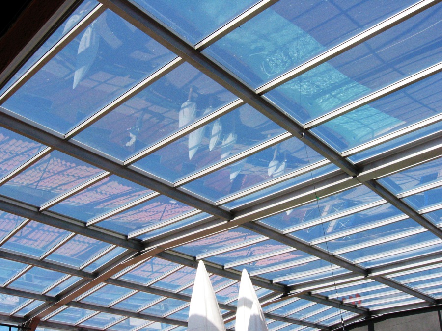 Cubierta descendente, a 1 agua, se realiza en varias opciones sistema universal de policarbonato de 10 mm de total estanqueidad y máxima garantía general electric • canalón y bajantes + 2 cuchillos laterales • .La estructura básica adjuntamos croquis de estructura fabricada totalmente en aluminio con viga especial de 178x100 mm ( ver ficha adjunta) lacada al horno y con tapetas para tapar toda la tornilleria de acero inox. De rosca métrica B) paramentos verticales 1ª) laterales fijos con divisorios verticales y cuchillos y/o 2º) correderas de alta gama sunroom s.60 lacadas 8017 y acristaladas en : a) policarbonato celular de 16 mm. B/hielo doble acristalamiento aislaglas 4//cámara 10 //4