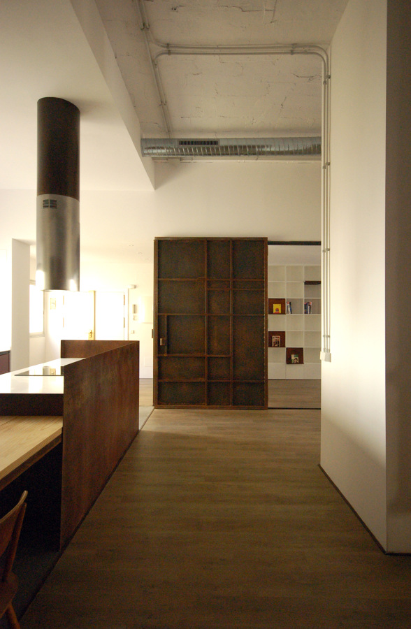 El proyecto que os mostramos a continuación es uno de esos que se sale de la norma habitual. El cliente acudió a nuestro estudio teniendo muy claro que quería un loft de carácter industrial que no terminara resultando una vivienda “fría”. A partir de estas condiciones nos dio libertad para proponer ideas. El punto de partida para nosotras: 180 m2 de oficinas en un edificio que antes fue una fábrica de hielo, diáfanos y con 4 m de altura libre. ¡Son unas condiciones poco comunes! El programa propuesto por el propietario es sencillo y poco fragmentado: salón, cocina y estudio pueden estar en un mismo espacio, una habitación eventual que también podría incorporarse a los anteriores, habitación principal con vestidor y baño propios y un baño de invitados y zona de lavandería como zonas de servicio más privadas. La ordenación del mismo lo dan las condiciones de la propia vivienda: las zonas con los usos principales dan a la fachada principal y las zonas de servicio están próximas al patio interior. El reto de este proyecto es que tanto espacio libre resulte interesante de vivir sin perderse en él. Tuvimos claros los materiales con los que trabajar desde el principio: acero, vidrio y microcemento en el pavimento de las zonas húmedas y de servicio y la madera a petición también del propietario, para compensar y dar calidez, en el suelo del resto de los espacios y el mobiliario a medida. Además, si podíamos recuperar los pilares de hormigón y algún muro de ladrillo visto, los incorporaríamos al proyecto. La gran apuesta en esta reforma estuvo en utilizar planchas de acero oxidado de 270 cm de altura soldadas entre sí y que en su conjunto conforman el “tabique” separador entre la zona de día y la de noche. El “tabique” se va plegando en toda su longitud y en sus formas recoge el mobiliario que va dando servicio a una estancia o a otra. Para definir el volumen que incluye el armario del hall y la habitación eventual también utilizamos el acero. Junto a dicho armario, se recoge un portón que recuerda a la puerta de una fábrica, corredero y abatible, de grandes dimensiones y con la estructura de bastidores vista. La gran estantería propuesta en esta zona, que hace las veces de biblioteca, también incorpora piezas de acero plegado y oxidado como expositores de libros. Esperamos que os guste el resultado tanto-tanto como esfuerzo hemos invertido en él! ;) Ficha del proyecto: Contratista: ingeninsa SL Fotografías: la reina obrera