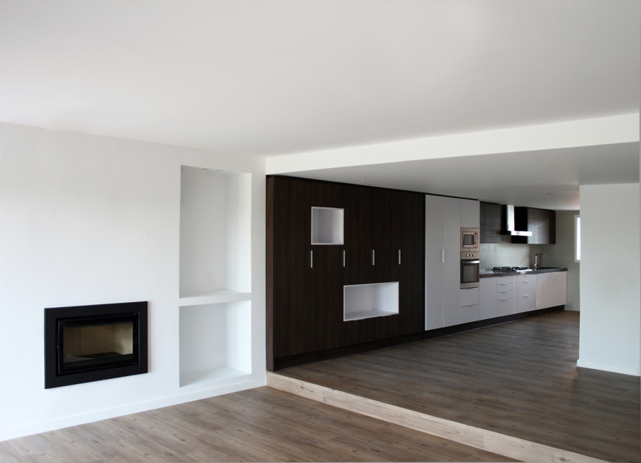 Briefing: El encargo responde a la necesidad de reformar una vivienda unifamiliar con 20 años de antigüedad, para adaptarla al estilo de vida de los nuevos propietarios, una joven pareja con dos niños pequeños. El proyecto requería una actualización en el diseño de acabados, fríos y ya obsoletos, redistribución de espacios generando una interrelación entre las zonas destinadas a salón, comedor y cocina, incorporación de barandilla en escalera, un incremento en la entrada de luz natural y aumento del espacio de almacenaje. Propuesta: Generar espacios permeables entre si, para conseguir una fluidez y comunicación visual, y al mismo tiempo, unificar usos que enfaticen dicha interrelación. Desarrollo: se derribaron tabiques e incorporaron materiales cálidos como la madera en distintas tonalidades ( sustituyendo al antiguo mármol ), para pavimento y acabados de muebles de cocina y almacenaje. De esta manera, se generó un espacio unificado tanto visual como funcionalmente, donde los límites entre las zonas de cocina, comedor y salón aparecen desdibujados; todo está conectado a través de un mismo alzado, donde se incorpora la cocina, un gran bloque de almacenaje, volumen de chimenea, y por último, el jardín. Se diseñó una barandilla a prueba de niños que no invadiera el espacio visualmente y sirviera como tamiz para la incidencia de luz natural. Cliente: pareja con dos niños pequeños Tipología: vivienda unifamiliar adosada Superficie: 120m2 Ubicación: las matas - madrid Año: 2012