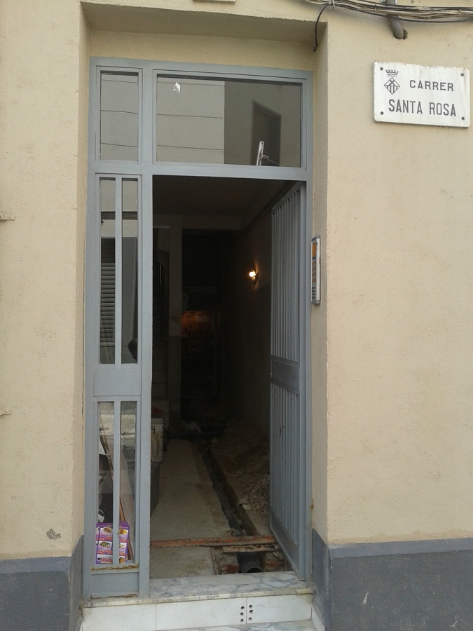 Rehabilitación integral del hall de la entrada, colocación de mármol en crema marfil, sustitución del ramal de enlace de agua general y arqueta, restauración de la puerta de hierro de la entrada y pintado.