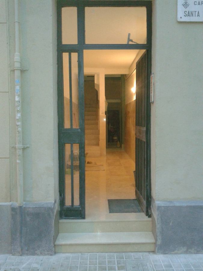 Rehabilitación integral del hall de la entrada, colocación de mármol en crema marfil, sustitución del ramal de enlace de agua general y arqueta, restauración de la puerta de hierro de la entrada y pintado.