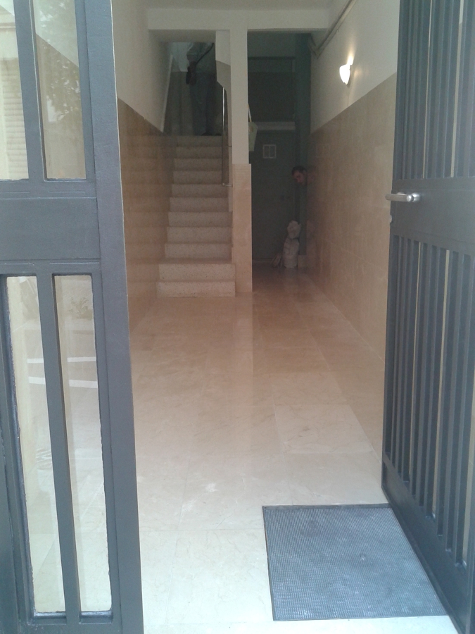 Rehabilitación integral del hall de la entrada, colocación de mármol en crema marfil, sustitución del ramal de enlace de agua general y arqueta, restauración de la puerta de hierro de la entrada y pintado.
