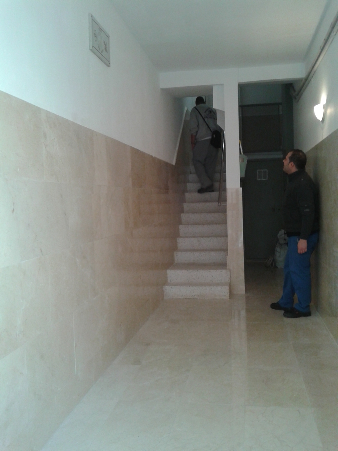 Rehabilitación integral del hall de la entrada, colocación de mármol en crema marfil, sustitución del ramal de enlace de agua general y arqueta, restauración de la puerta de hierro de la entrada y pintado.