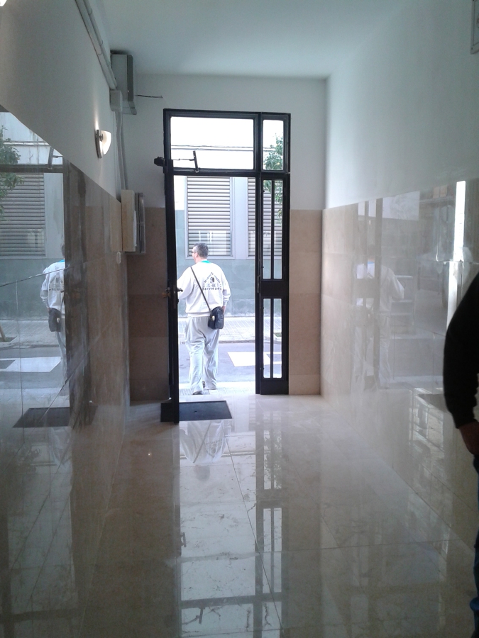 Rehabilitación integral del hall de la entrada, colocación de mármol en crema marfil, sustitución del ramal de enlace de agua general y arqueta, restauración de la puerta de hierro de la entrada y pintado.