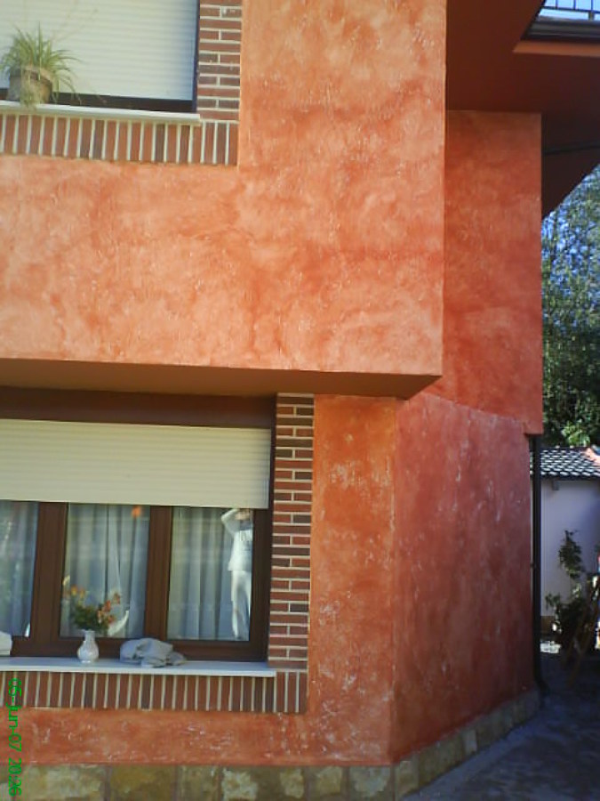 Chalet que en un principio tenía un liso bastante malo,optamos por darle la idea al cliente de encerarlo y hacerle una pátina en rojo sobre una superficie rústica y muy decorativa especialidad de nuestros profesionales ,utilizando material de rústico beissier exteriores y ceras badi a esponja en color rojo y ocres mezclados a mano.Alero con revestimiento sikkens de gran calidad y barandillas y rejas exteriores efecto dorado con forja negra de la marca procolor.