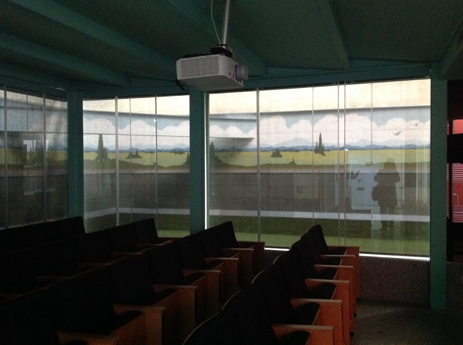Suministro e instalacion de cortinas enrollables motorizadas con somfy y mando a distancia multicanal para zona exposiciones con polyscreen 1% en negro y motorizadas con interruptor para zona laboratorio y oficina de polyscreen 5%. Control solar controlado y decoracion moderna de lineas rectas con estilo de vanguardia.