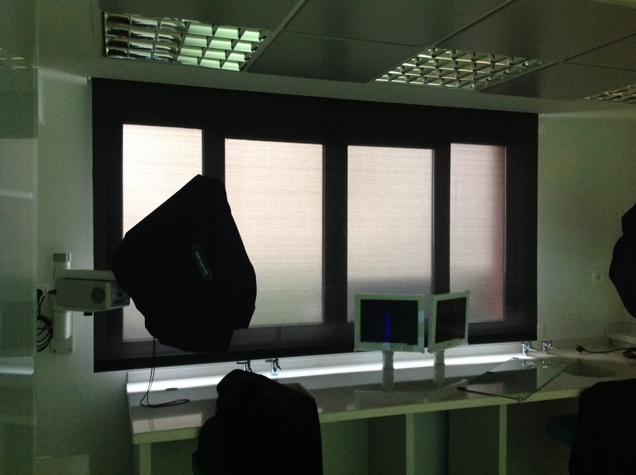 Suministro e instalacion de cortinas enrollables motorizadas con somfy y mando a distancia multicanal para zona exposiciones con polyscreen 1% en negro y motorizadas con interruptor para zona laboratorio y oficina de polyscreen 5%. Control solar controlado y decoracion moderna de lineas rectas con estilo de vanguardia.