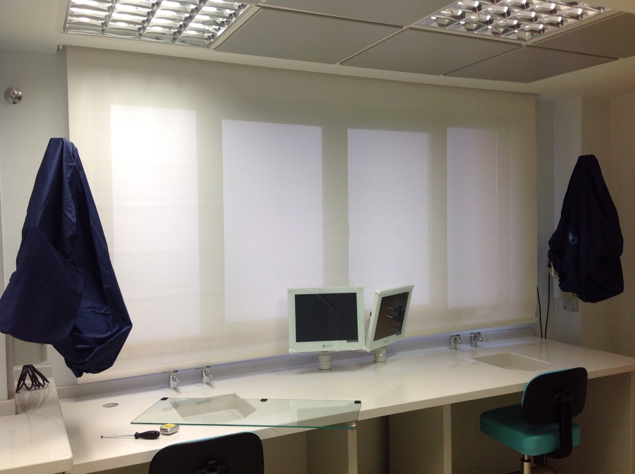 Suministro e instalacion de cortinas enrollables motorizadas con somfy y mando a distancia multicanal para zona exposiciones con polyscreen 1% en negro y motorizadas con interruptor para zona laboratorio y oficina de polyscreen 5%. Control solar controlado y decoracion moderna de lineas rectas con estilo de vanguardia.