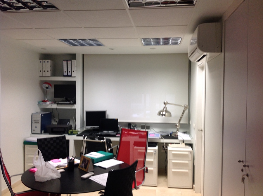 Suministro e instalacion de cortinas enrollables motorizadas con somfy y mando a distancia multicanal para zona exposiciones con polyscreen 1% en negro y motorizadas con interruptor para zona laboratorio y oficina de polyscreen 5%. Control solar controlado y decoracion moderna de lineas rectas con estilo de vanguardia.