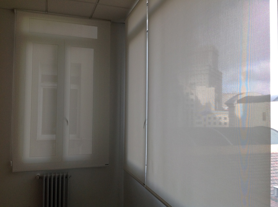 Suministro e instalacion de cortinas verticales con accion a cadena , y distanciadora y cordon con tejido tecnico polyscreen 5% en color perla para zona oficina exterior y para la zona de laboratorio cortina enrollable de accionamiento a cadena y contrapeso oculto con tejido tecnico polyscreen 5% en oficina de gran via