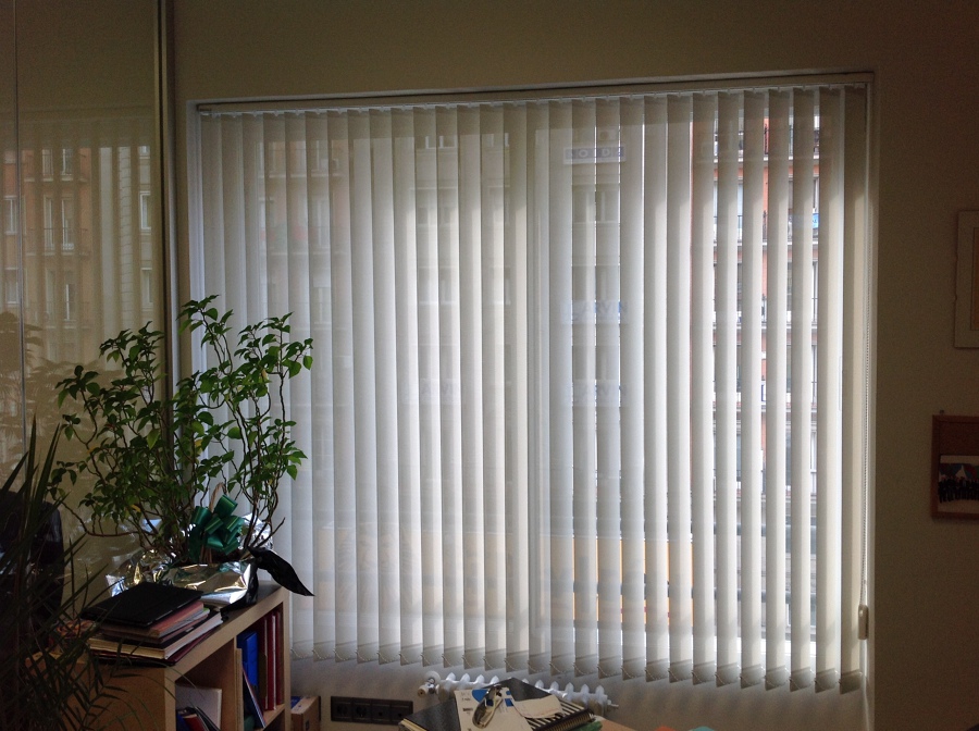 Suministro e instalacion de cortinas verticales con accion a cadena , y distanciadora y cordon con tejido tecnico polyscreen 5% en color perla para zona oficina exterior y para la zona de laboratorio cortina enrollable de accionamiento a cadena y contrapeso oculto con tejido tecnico polyscreen 5% en oficina de gran via