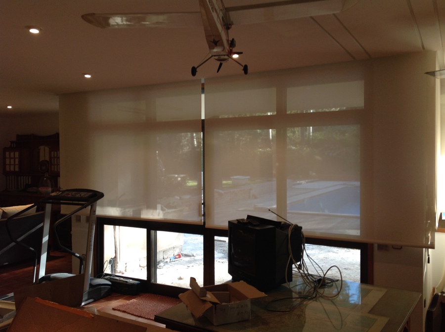 Suministro e instalacion de cortinas enrollables motorizadas sistema rts con mando multicanal somfy y con interuptor rts y tejido tecnico polyscreen 5% en tono blanco para todas las estancias de chalet en somosaguas Motorizamos las persianas exteriores con motor somfy sistema rts con mando a distancia multicanal e interruptor rts en todas las estancias de la vivienda
