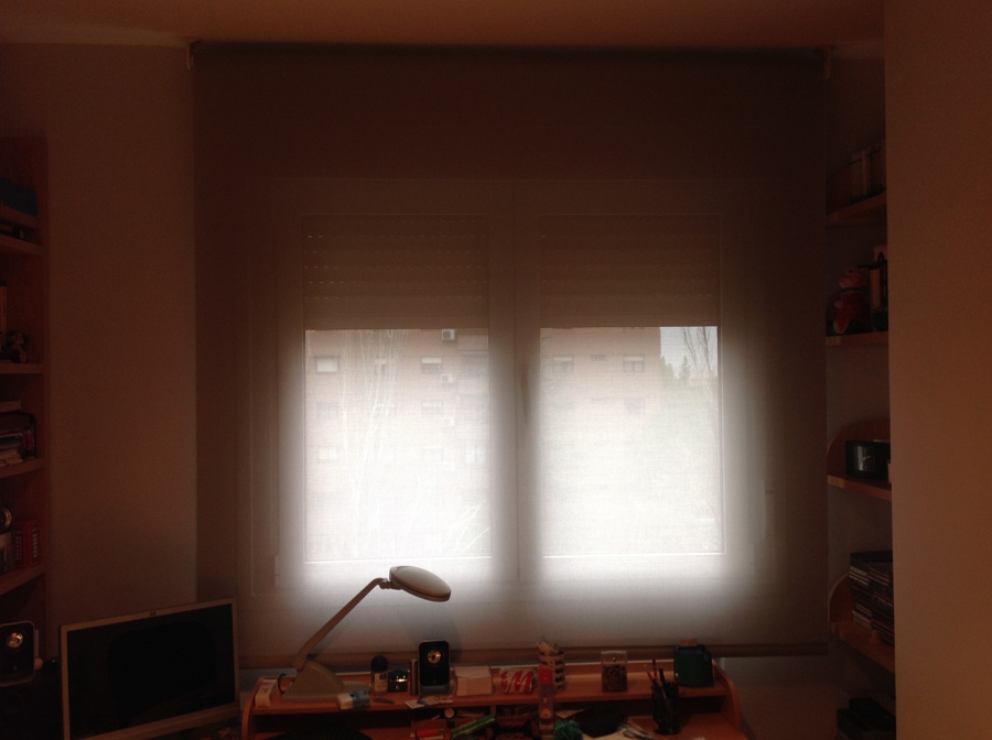 Estores paccetto con tejidos en gama alta con lino 100% en habitacion principal y en habitaccion 2 lino con lineas de fantasia en color que aportan una decoracion y luminosidad a la habitacion. Cortinas enrollables en gama alta colores en varios hilos con accionamiento a cadena y 5% de grado de apertura en zona salon y habitacion 1, asi como en aseo con un 10% de apertura y color blanco.