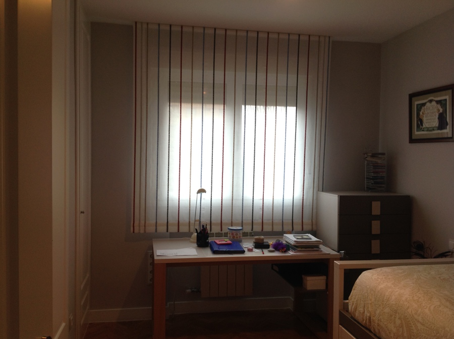 Estores paccetto con tejidos en gama alta con lino 100% en habitacion principal y en habitaccion 2 lino con lineas de fantasia en color que aportan una decoracion y luminosidad a la habitacion. Cortinas enrollables en gama alta colores en varios hilos con accionamiento a cadena y 5% de grado de apertura en zona salon y habitacion 1, asi como en aseo con un 10% de apertura y color blanco.