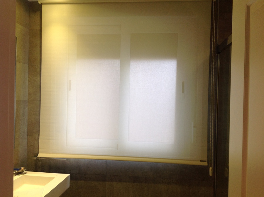 Estores paccetto con tejidos en gama alta con lino 100% en habitacion principal y en habitaccion 2 lino con lineas de fantasia en color que aportan una decoracion y luminosidad a la habitacion. Cortinas enrollables en gama alta colores en varios hilos con accionamiento a cadena y 5% de grado de apertura en zona salon y habitacion 1, asi como en aseo con un 10% de apertura y color blanco.