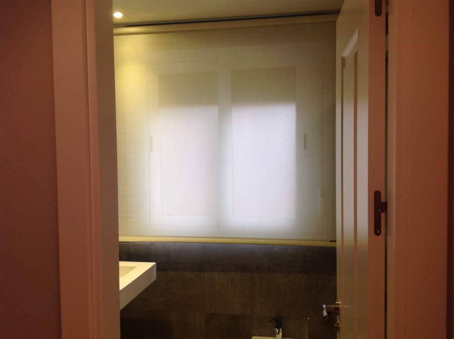 Estores paccetto con tejidos en gama alta con lino 100% en habitacion principal y en habitaccion 2 lino con lineas de fantasia en color que aportan una decoracion y luminosidad a la habitacion. Cortinas enrollables en gama alta colores en varios hilos con accionamiento a cadena y 5% de grado de apertura en zona salon y habitacion 1, asi como en aseo con un 10% de apertura y color blanco.