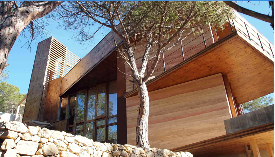 La casa vilaret está situada en una urbanización de la zona del garraf, de clima mediterráneo. La idea fundamental son dos cuerpos de alta inercia térmica en forma de “U”, donde se sitúan los dormitorios y las salas de estar, unidos por una caja de cristal donde se sitúan los servicios tales como la cocina, la zona de aguas y el cuarto de instalaciones. El objetivo principal del proyecto era buscar el máximo de autosuficiencia, tanto a nivel energético como de gestión de residuos y materiales. Así pues, hay tres estrategias básicas para conseguir dicho objetivo; A-reducir las pérdidas energéticas del envoltorio de la casa B-Generar energía y reducir los residuos C-Hacer un sistema integral de aguas. El terreno es de elevada pendiente; esto sirve para enterrar parcialmente la casa y aprovechar al máximo la temperatura constante de la tierra y su inercia térmica, ganar privacidad respeto al dominio superior de la calle de acceso, integrarse en el paisaje y aprovechar un concepto básico para el movimiento de las aguas como es la gravedad. La cubierta sigue la alineación de parcela, de hecho es perpendicular a las curvas de nivel del terreno. Pero la planta de la casa, dibuja un giro respecto a la cubierta para orientarse al sur geométrico y abrirse todo lo posible a las cualidades de dicha orientación; esto es, que entre el sol durante los meses fríos de invierno y evitar el sol en verano. La estructura de la casa es de madera contra laminada estructural, reduciendo el uso de hormigón e incentivando la construcción en seco, con materiales renovables y prefabricados.