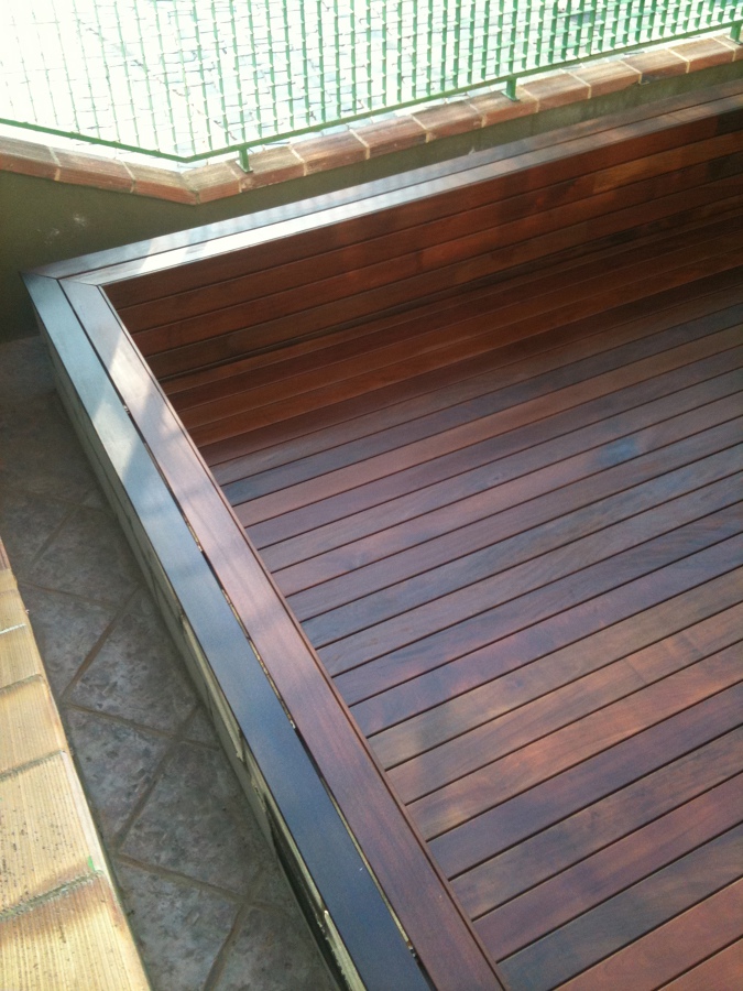 Instalación de suelo en madera de IPE sobre rastreles de madera de iroko, forrado de jardineras de obra para dar continuidad al suelo de la terraza. Tratamiento con aceite especial para maderas tropicales.