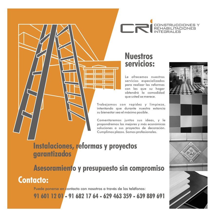 Grupo construcciones y rehabilitaciones politécnicas pone a su disposición la experiencia de una empresa líder en la gestión y ejecución de proyectos donde la atención al cliente y la calidad son nuestra mayor prioridad. La garantía de servicio avala la profesionalidad que ponemos en cada una de nuestras obras, brindando a nuestros clientes asesoramientos y servicios personalizados. CRP dispone de un servicio integral CRi, solo con una llamada dispondrá de todos los profesionales que necesita para la realización de su proyecto. Solicítenos presupuesto sin compromiso. Esperando que nuestra oferta sea de su agrado, aprovechamos para enviarle un cordial saludo.