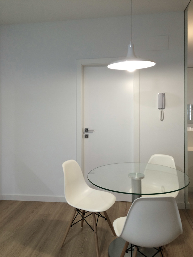 - comedores · reforma integral vivienda · minimalista · lámpara techo · mesa cristal comedor · sillas eames blancas